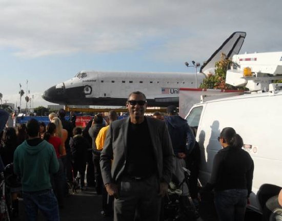 Knowing that the VIP seating was planned at the Crenshaw Shopping Plaza, I opted to be a part of the assembled multitude in the street. The VIP seating and performance stage did not afford one a view of Endeavour as it first appears on Crenshaw Blvd from King Blvd and that what I wanted to see. The Orbiter would travel north on Crenshaw Blvd. but not come into view from King Blvd. until after it turned a corner near Stocker Street; which runs near my condo. To get the highest viewing position available I arrived at noon—two hours before the show and later I found a KTLA TV truck set up in the Krispy Kreme Doughnut Shop parking lot near the corner to climb up on. I would hang on to the truck’s ladder assembly for hours! Having got there early to secure good viewing spots, TSM associate Gwen Durham who lives nearby showed up shortly thereafter and my wife, Viilma arrived hours later—just before the 2 PM scheduled starting time.
